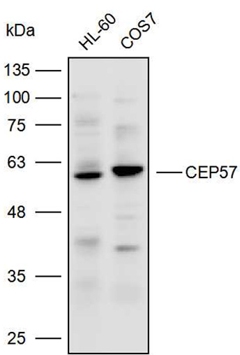 Western blot analysis with CEP57 antibody diluted at 1:2000;Lane:HL-60,COS7