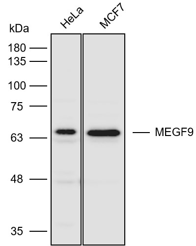 Western blot analysis with MEGF9 antibody diluted at 1:2000;Lane:Hela,MCF7