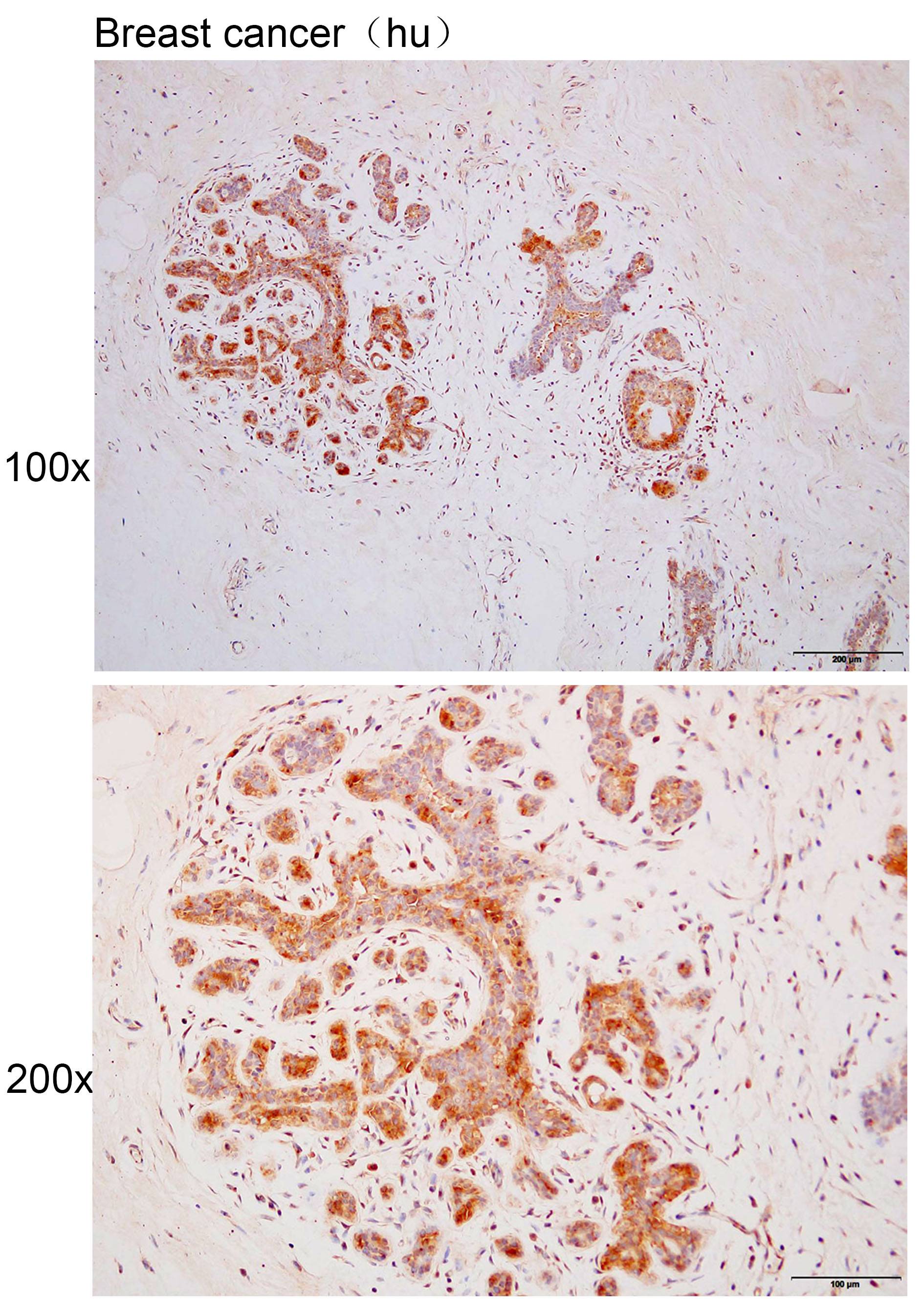 Immunohistochemistry of paraffin-embedded Human breast cancer using RABL2B antibody diluted at 1:100.
