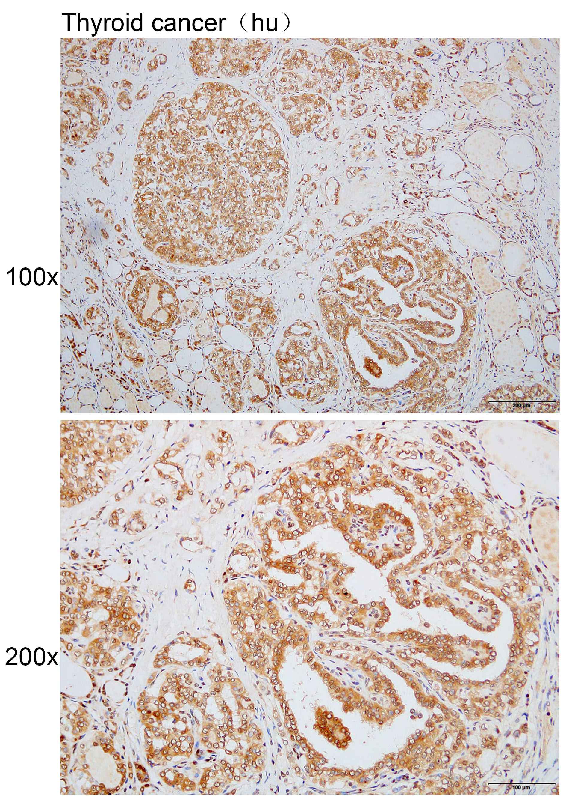 Immunohistochemistry of paraffin-embedded Human thyroid cance using THNSL1 antibody diluted at 1:80.