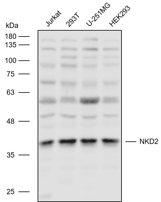 Western blot analysis with NKD2 antibody diluted at 1:2000;Lane:Jurkat,293T,U-251MG,HEK293
