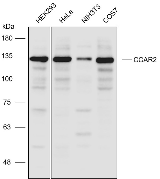 Western blot analysis with CCAR2 antibody diluted at 1:2000;Lane:HEK-293,HeLa,COS7,NIH3T3