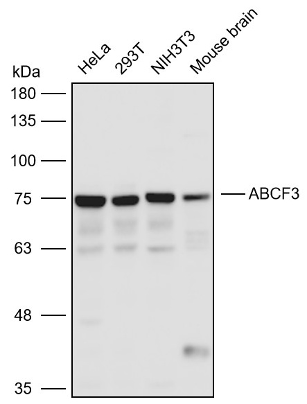 Western blot analysis with ABCF3 antibody diluted at 1:2000;Lane:HeLa,293T,NIH3T3,Mouse brain