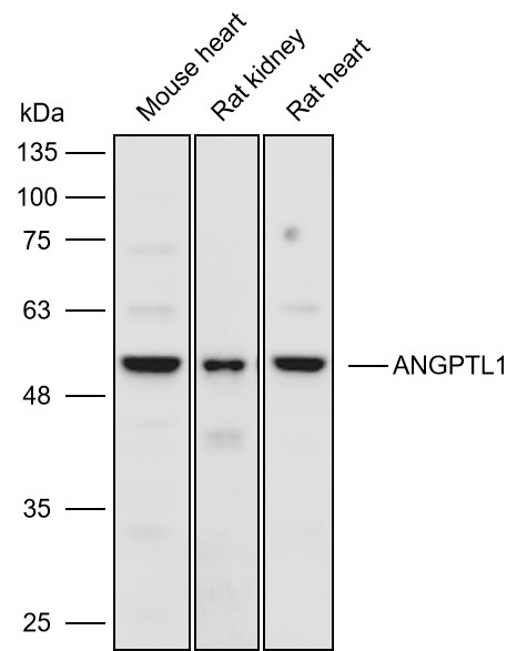 Western blot analysis with ANGPTL1 antibody diluted at 1:2000;Lane:Mouse heart,Rat kidney,Rat heart