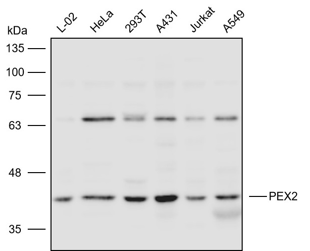 Western blot analysis with PEX2 antibody diluted at 1:2000;Lane:L02,Hela,293T,A431,Jurkat,A549