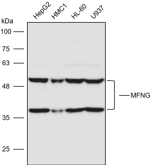 Western blot analysis with MFNG antibody diluted at 1:2000;Lane:HepG2,HMC-1,HL60,U937
