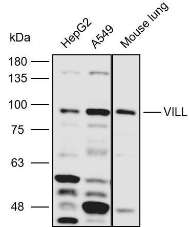 Western blot analysis with VILL antibody diluted at 1:2000;Lane:HepG2,A549,Mouse lung