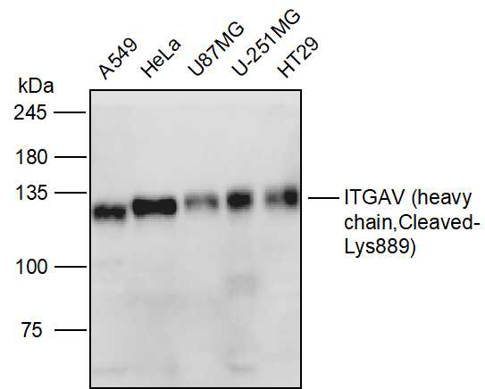 Western blot analysis with ITGAV (heavy chain,Cleaved-Lys889) antibody diluted at 1:2000;Lane:A549,HeLa,U87,U251,HT29