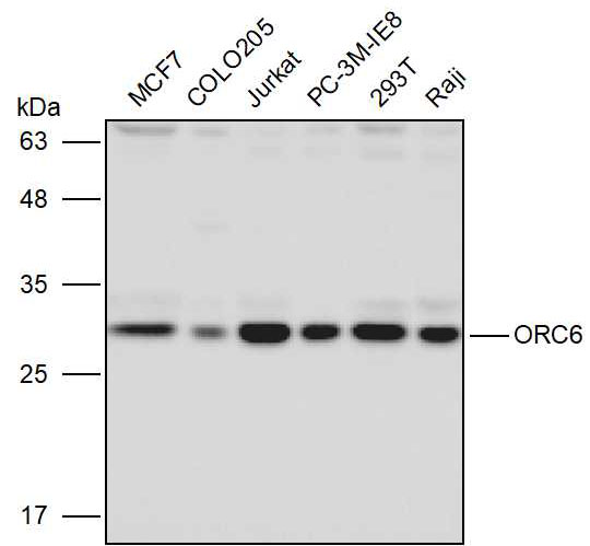 Western blot analysis with ORC6 antibody diluted at 1:2000;Lane:MCF-7,COLO205,Jurkat,PC-3,293T,Raji