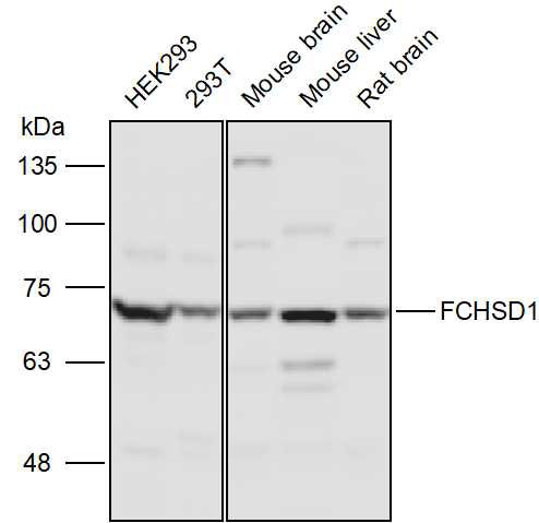 Western blot analysis with FCHSD1 antibody diluted at 1:2000;Lane:HEK-293,293T,Mouse brain,Mouse liver,Rat brain