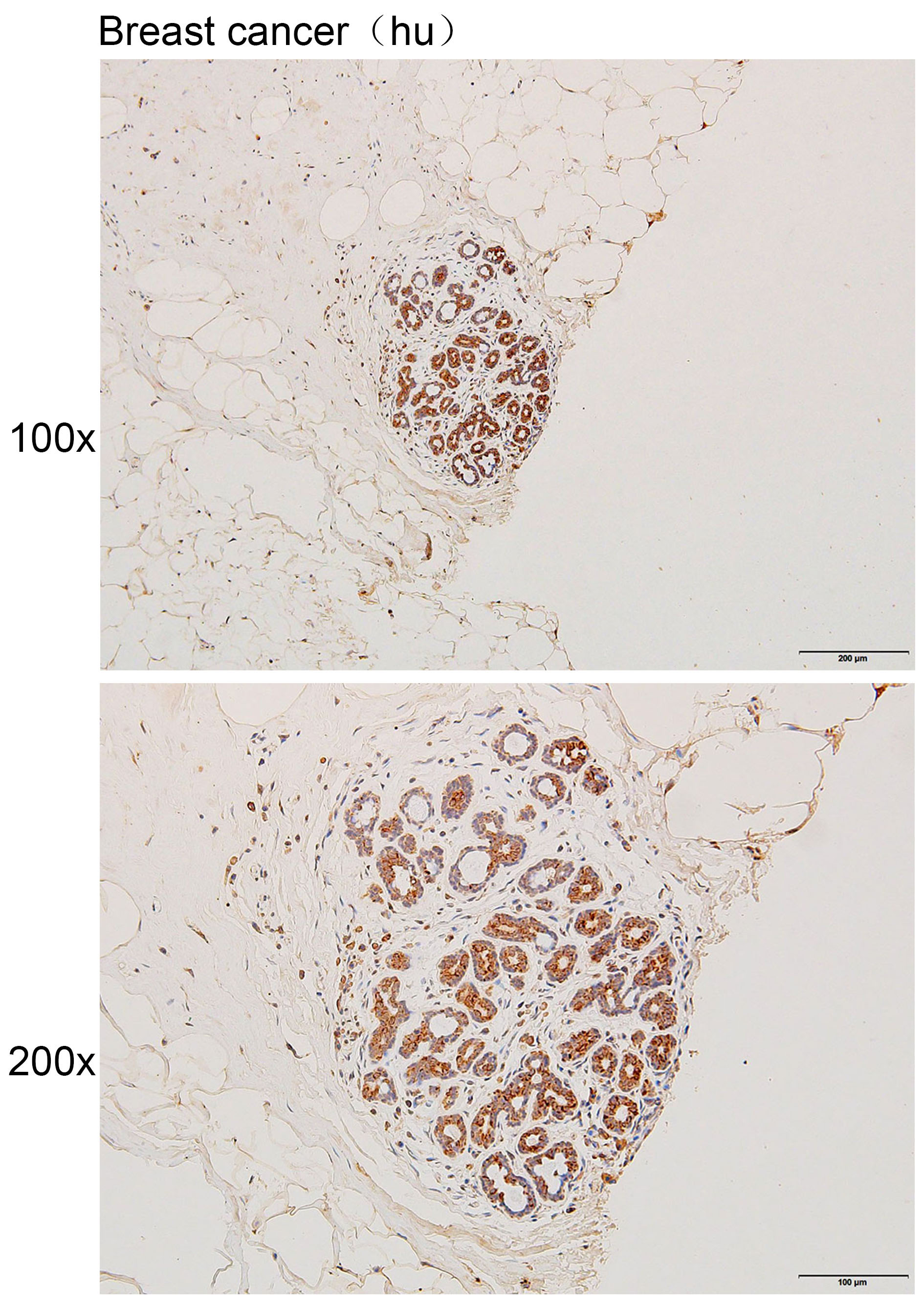 Immunohistochemistry of paraffin-embedded Human breast cancer with USP15 antibody diluted at 1:100.