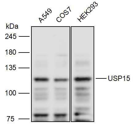 Western blot analysis with USP15 antibody diluted at 1:2000;Lane:A549,COS7,HEK-293