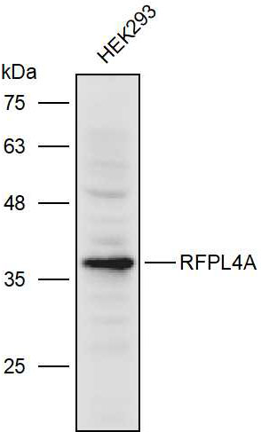 Western blot analysis with RFPL4A/RFPL4AL1 antibody diluted at 1:2000;Lane: HEK293.
