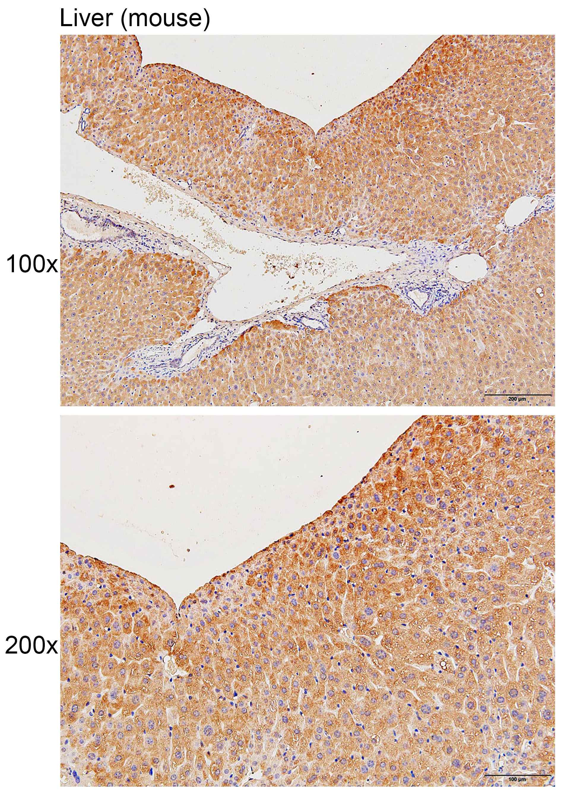 Immunohistochemistry of paraffin-embedded Mouse liver with PLG (heavy chain A short form, Cleaved-Val 98) antibody diluted at 1:200.