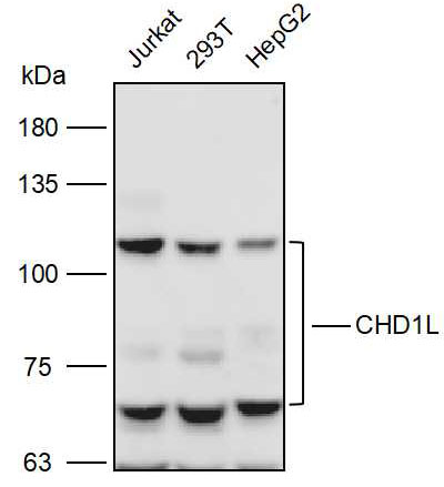 Western blot analysis with CHD1L antibody diluted at 1:2000;Lane:Jurkat,293T,HepG2