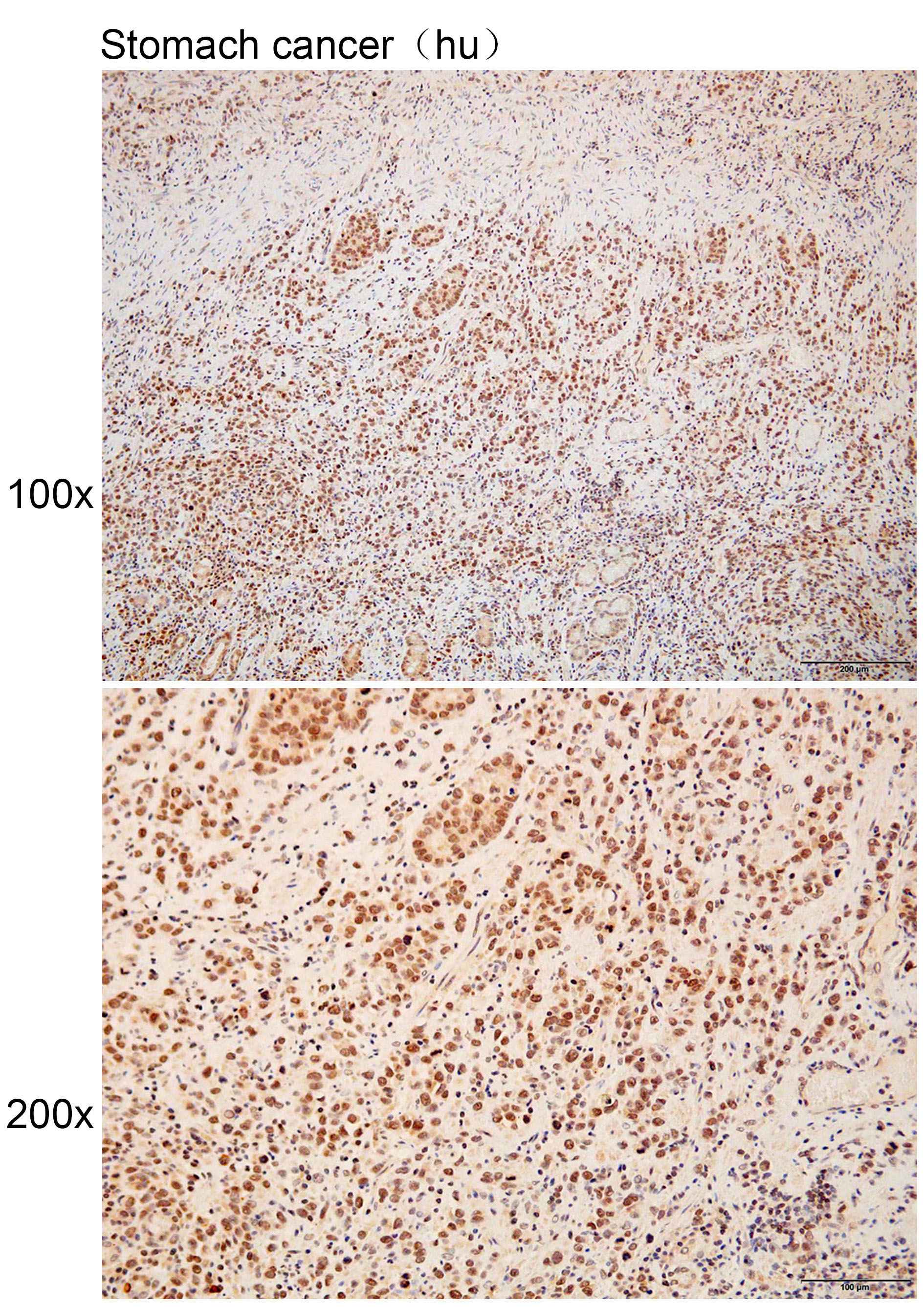 Immunohistochemistry of paraffin-embedded Human stomach cancer with CHD1L antibody diluted at 1:100.