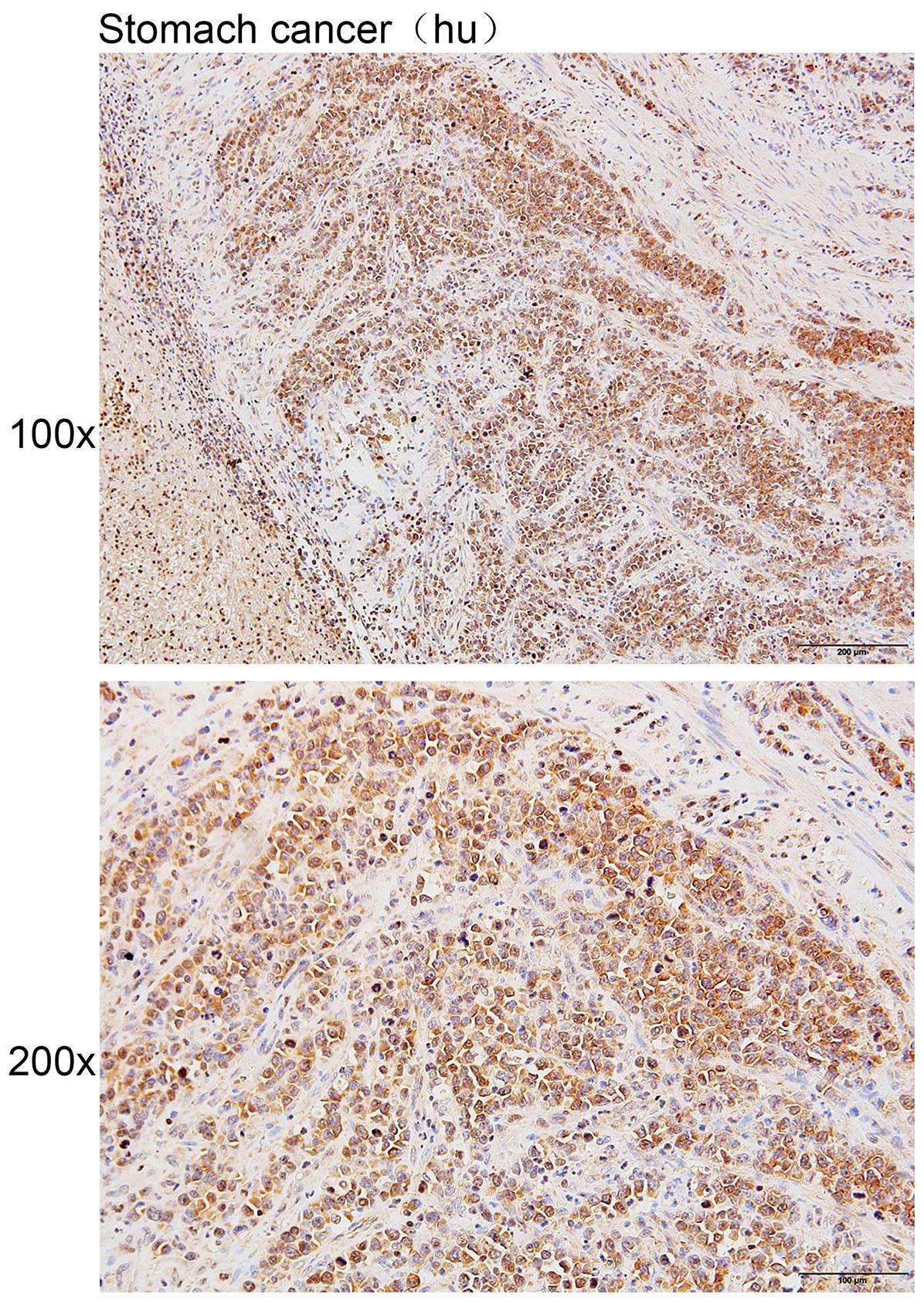 Immunohistochemistry of paraffin-embedded Human stomach cancer with INTS3 antibody diluted at 1:80.