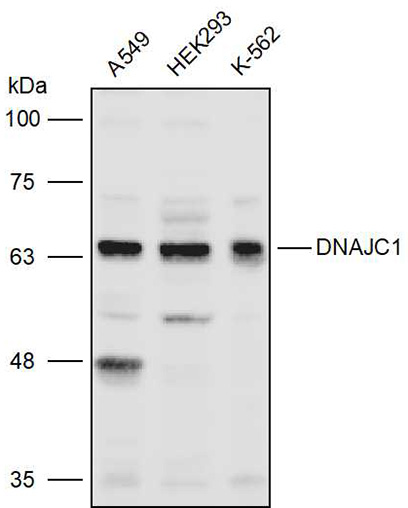 Western blot analysis with DNAJC1 antibody diluted at 1:2000;Lane: A549,HEK293,K562