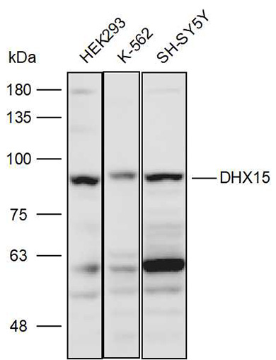 Western blot analysis with DHX15 antibody diluted at 1:3000;Lane: HEK-293,K562,SHSY5Y