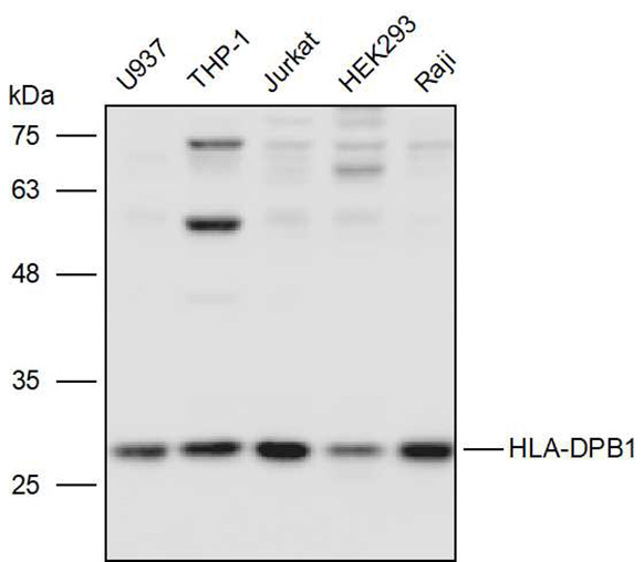 Western blot analysis with HLA-DPB1 antibody diluted at 1:2000;Lane: U937,THP-1,Jurkat,HEK293,Raji