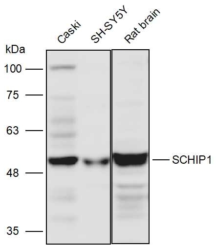 Western blot analysis with SCHIP1 antibody diluted at 1:2000;Lane: Caski,SHSY5Y,Rat brain