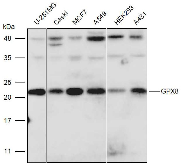 Western blot analysis with GPX8 antibody diluted at 1:2000;Lane: U-251,Caski,MCF7,A549,HEK-293,A431