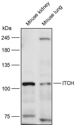 Western blot analysis with ITCH antibody diluted at 1:2000;Lane: Mouse kidney,Mouse lung.