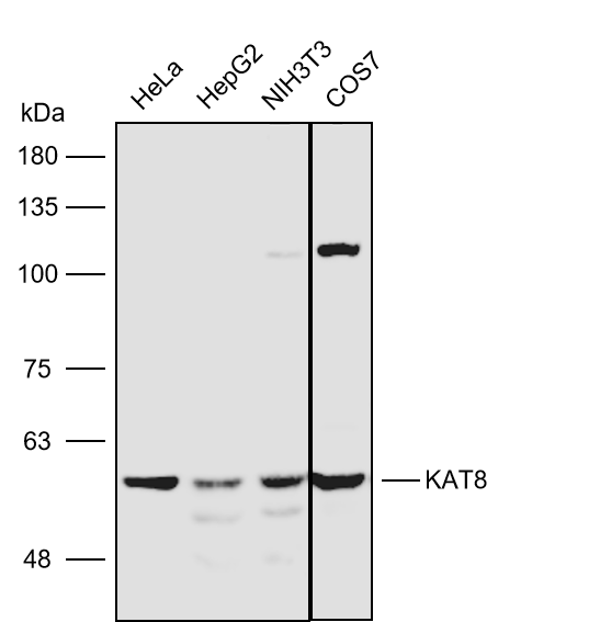 Western blot analysis with KAT8 antibody diluted at 1:2000;Lane: HeLa,HepG2,NIH/3T3,COS7