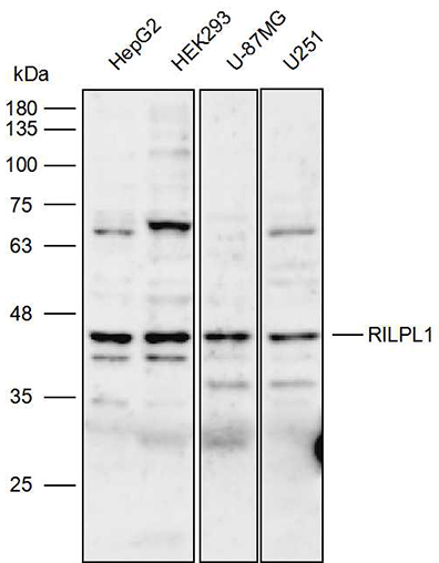 Western blot analysis with RILPL1 antibody diluted at 1:2000;Lane: HepG2,HEK293,U87,U251.