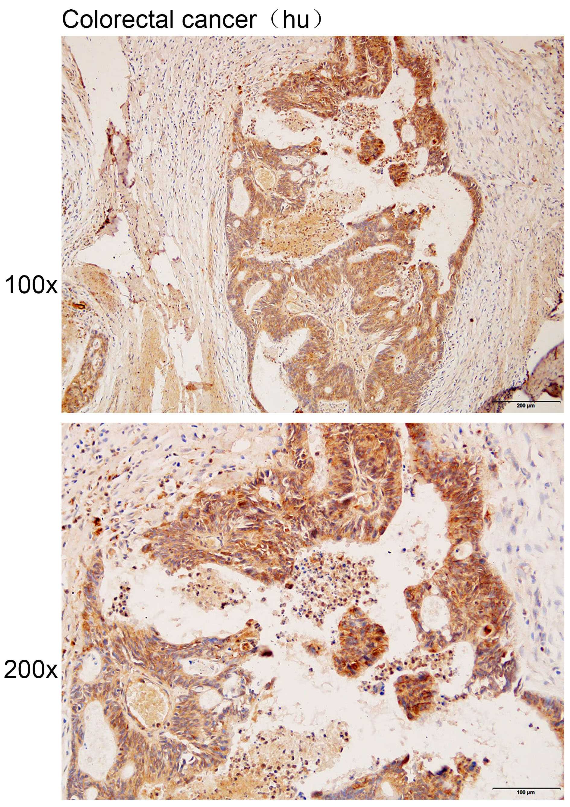 Immunohistochemistry of paraffin-embedded human colorectal cancer with MYOM2 antibody diluted at 1:100.