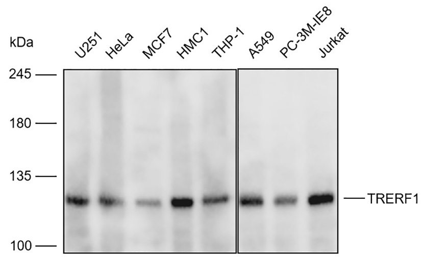 "Western blot analysis with TRERF1 antibody diluted at 1:2000;Lane: U-251MG