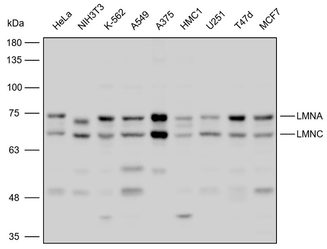 Western blot analysis with LMNA/LMNC antibody diluted at 1:2000;Lane: HeLa,NIH3T3,K-562,A549,A375,HMC1,U251,T47d,MCF7.