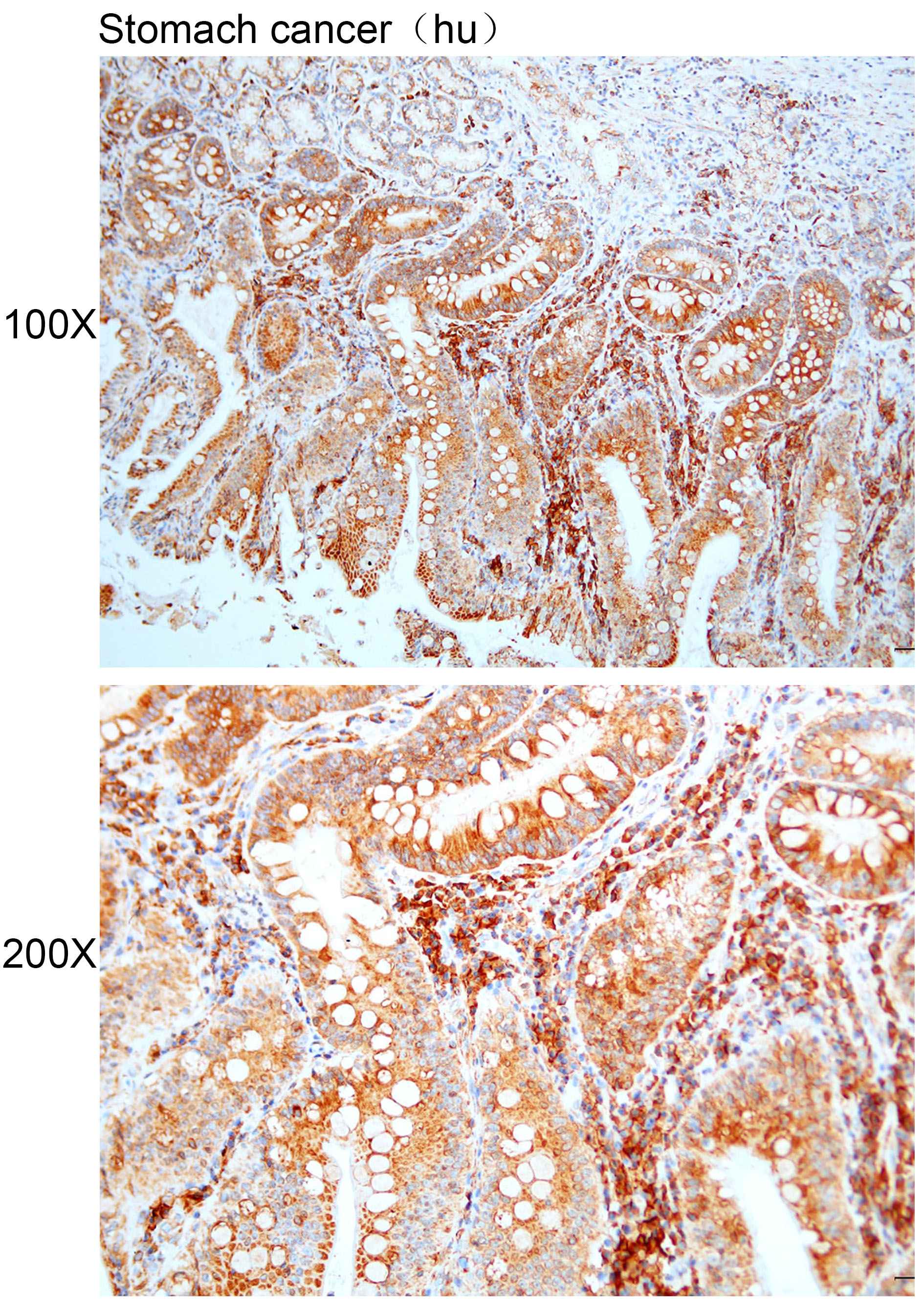 Immunohistochemistry of paraffin-embedded human stomach cancer with EMC4 antibody diluted at 1:100.