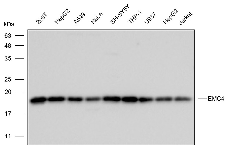 Western blot analysis with EMC4 antibody diluted at 1:2000;Lane: 293T,HepG2,A549,HeLa,SH-SY5Y,THP-1,U937,HepG2,Jurkat.