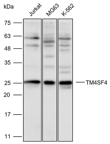 Western blot analysis with TM4SF4 antibody diluted at 1:500;Lane: Jurkat,MG63,K-562.