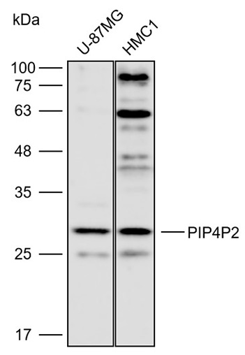 Western blot analysis with PIP4P2 antibody diluted at 1:2000;Lane: U87,HMC-1.