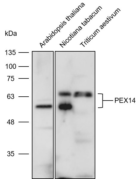 Western blot analysis with PEX14 antibody diluted at 1:1000; Lane: Arabidopsis thaliana; Nicotiana tabacum;Triticum aestivum.
