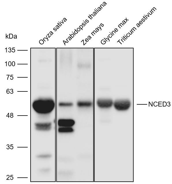 Western blot analysis with NCED3 antibody diluted at 1:2000; Lane: Oryza sativa; Arabidopsis thaliana; Zea mays; Glycine max; Triticum aestivum.