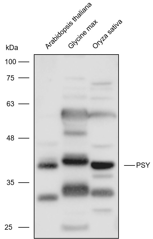 Western blot analysis with PSY antibody diluted at 1:2000; Lane: Arabidopsis thaliana; Glycine max; Oryza sativa.