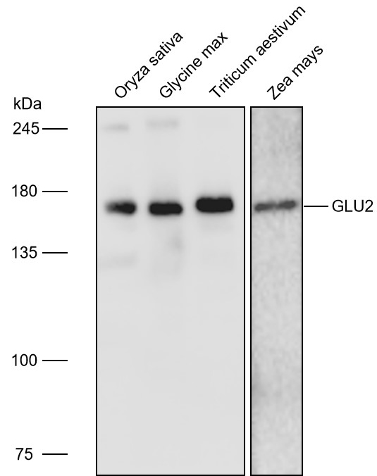 Western blot analysis with GLU2 antibody diluted at 1:2000; Lane: Oryza sativa; Glycine max; Triticum aestivum; Zea mays.