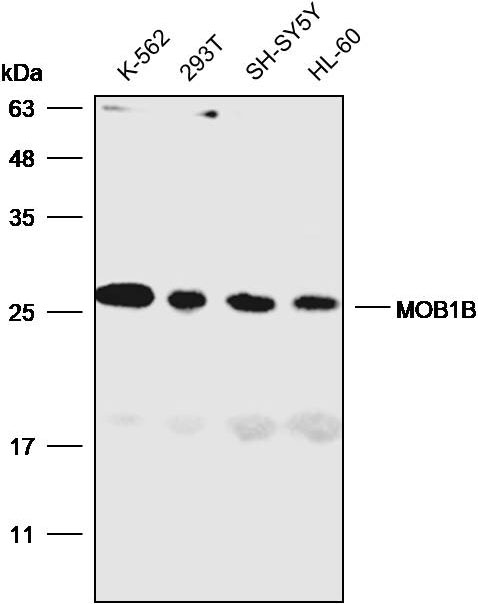 Western blot analysis with MOB1B antibody diluted at 1:1000;Lane: K-562,293T,SH-SY5Y,HL-60