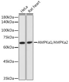 Western blot analysis with AMPKa1/AMPKa2 antibody diluted at 1:2000;Lane:HeLa,Rat liver