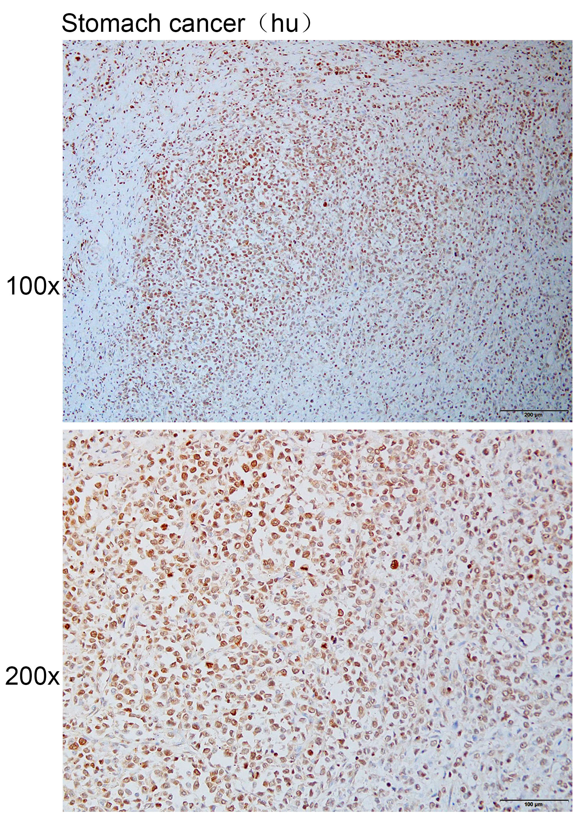 Immunohistochemistry of paraffin-embedded Human stomach cancer with CDK11A/CDK11B antibody