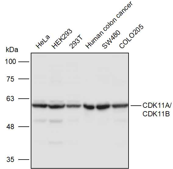 Western blot analysis with CDK11A/CDK11B antibody diluted at 1:2000;Lane: HeLa,HEK293,293T,Human colorectal cancer,SW480,Colo205.