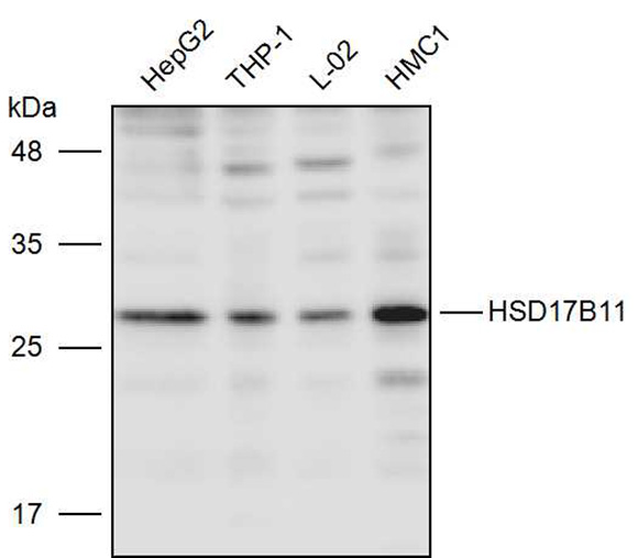 Western blot analysis with HSD17B11 antibody diluted at 1:2000;Lane: HepG2,THP-1,L-02,HMC1.