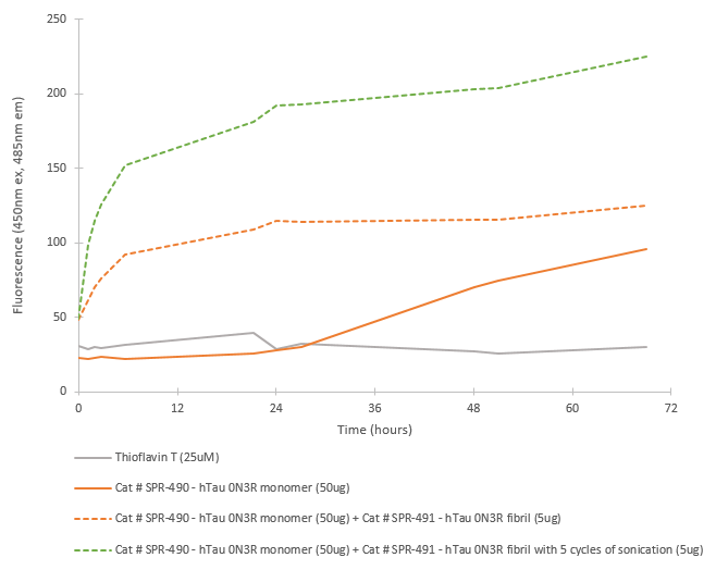 文献和实验的 Tau 蛋白单体并不自然存在于正常神经细胞中,并且 Tau 蛋白比较分散的位于轴突当中,浓度较低,不利于快速聚集形成纤维缠结。有多方研究表明,突变的 Tau 蛋白 PFFs 催化聚集过程要比野生型 Tau 快很多,而突变型全长 Tau PFFs 的催化聚集能力又比截短的 Tau PFFs 要有效一点。为了克服 Tau 蛋白聚集沉积过程慢的难题,StressMarq 推出四种活性 Tau 蛋白,可以加速 Tau 纤维缠结的形成。其中 P301S 是指在外显子 10 上发生的突变,该突变型 Tau