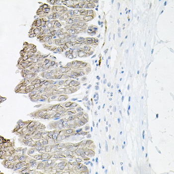 Immunohistochemistry of paraffin-embedded mouse stomach using ATP1B1 antibody at dilution of 1:100 (x40 lens).