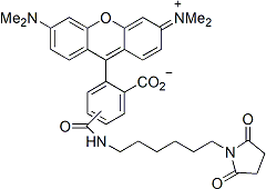 5(6)-羧基四甲基罗丹明马来酰亚胺所具有的C6连接能够在染料结合蛋白后增强荧光。产品可直接替代5(6)-carboxytetramethylrhodamine C5-maleimide (91040)。