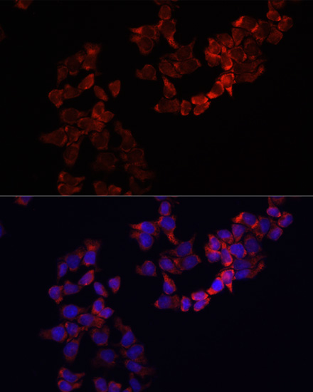 Immunofluorescence analysis of HeLa cells using YBX1 antibody (A7704) at dilution of 1:100. Blue: DAPI for nuclear staining.