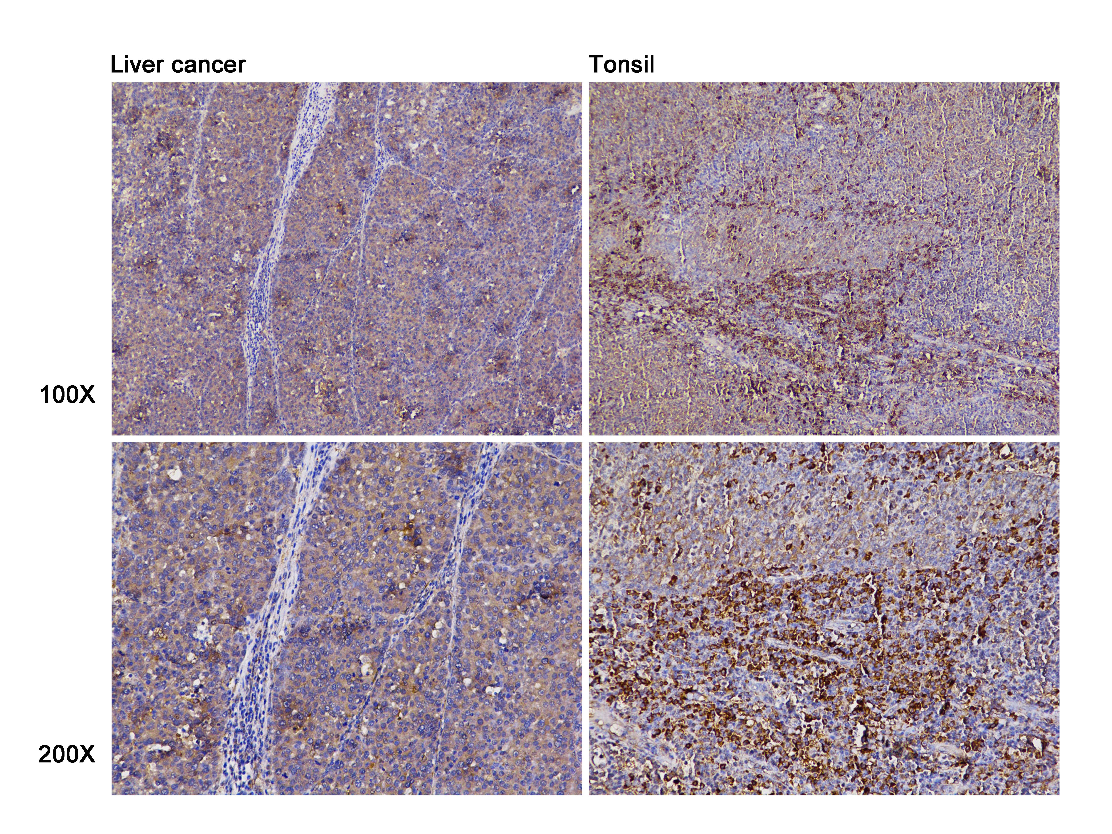 Immunohistochemistry of paraffin-embedded liver cancer(hu)/tonsil(hu) using TPMT antibody at dilution of 1:100 (x100 lens��x200 lens).
